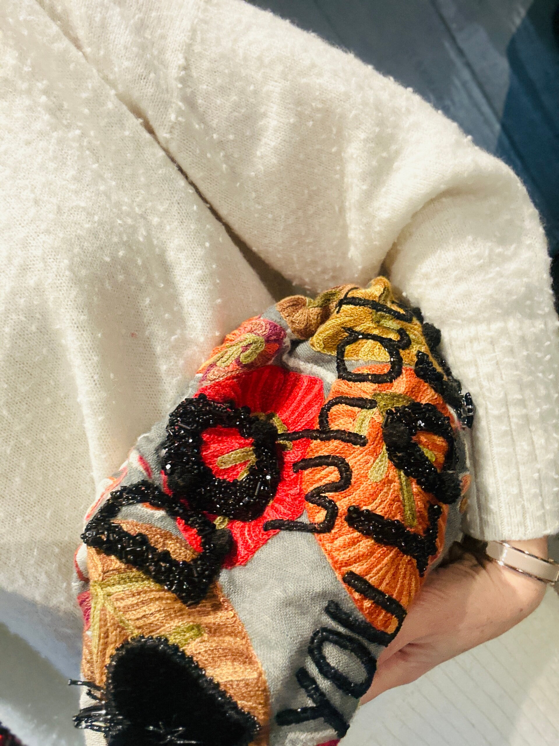Una colorata pashmina in cashmere è diventata la nostra base per realizzare questa pouch divertente e versatile con un messaggio ben preciso.