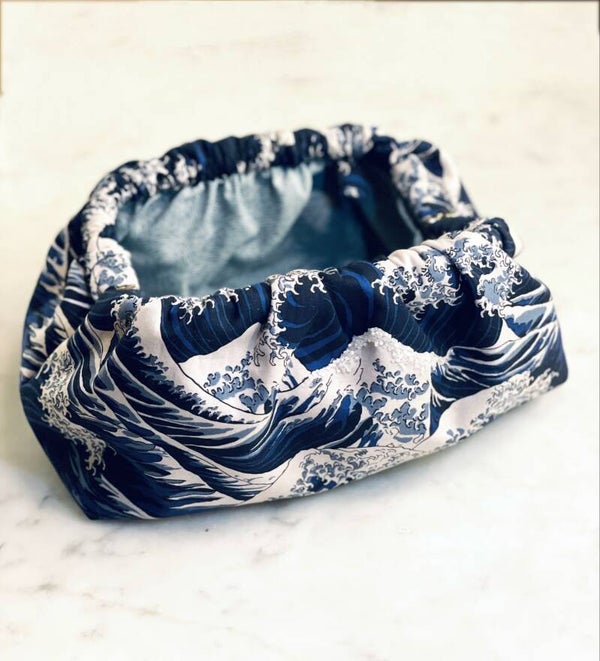 Tessuto in puro cotone Made in Japan sul quale ci siamo divertite ad enfatizzare le famose onde di Hokusai. Le onde sono diventate ancora più spumeggianti e super scintillanti.
