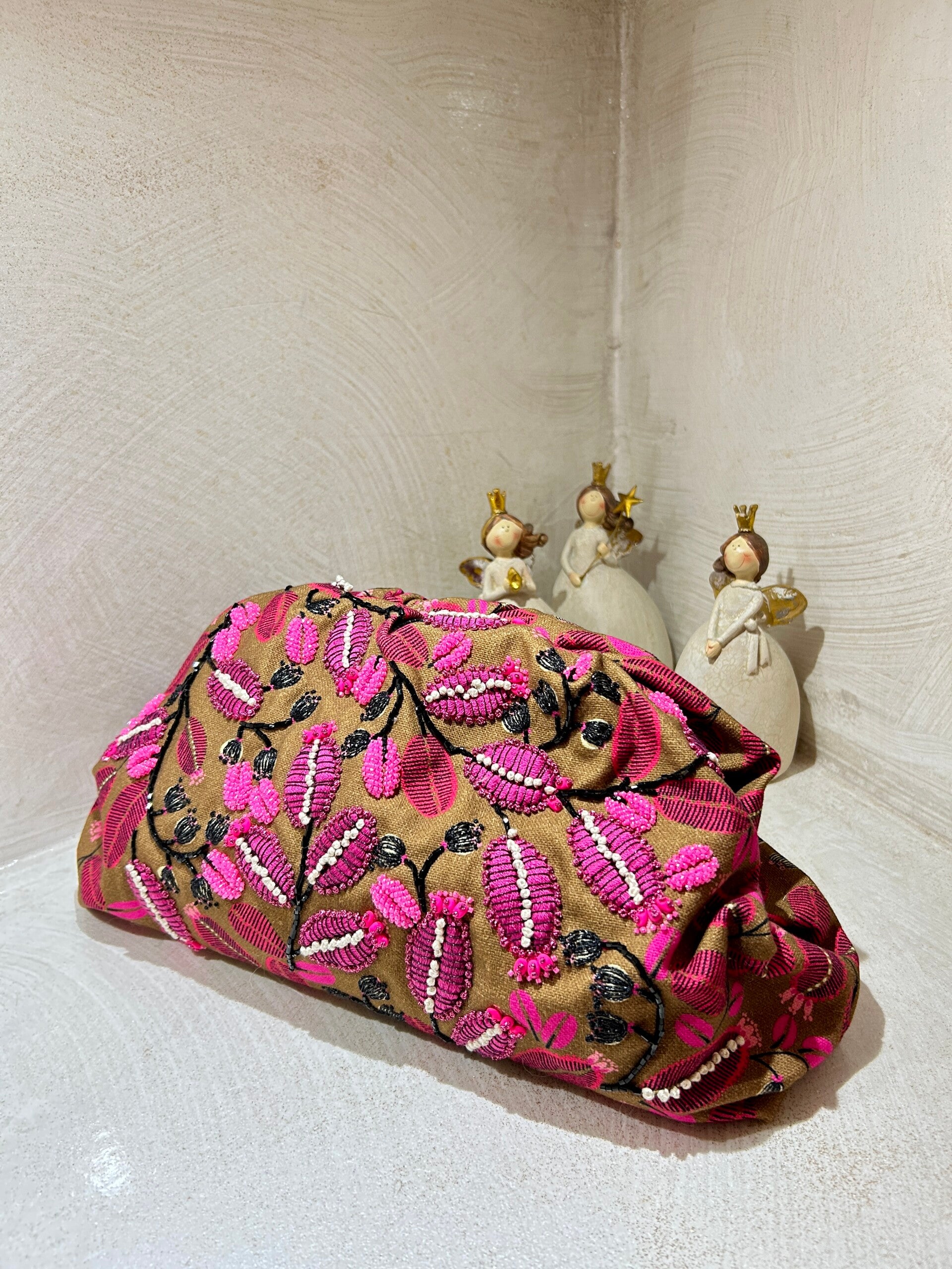Cotone misto lino francese per questa pouch con fondo cioccolato e tralci di fiori rosa fluo ricpoerti di filati e di perline tono su tono.