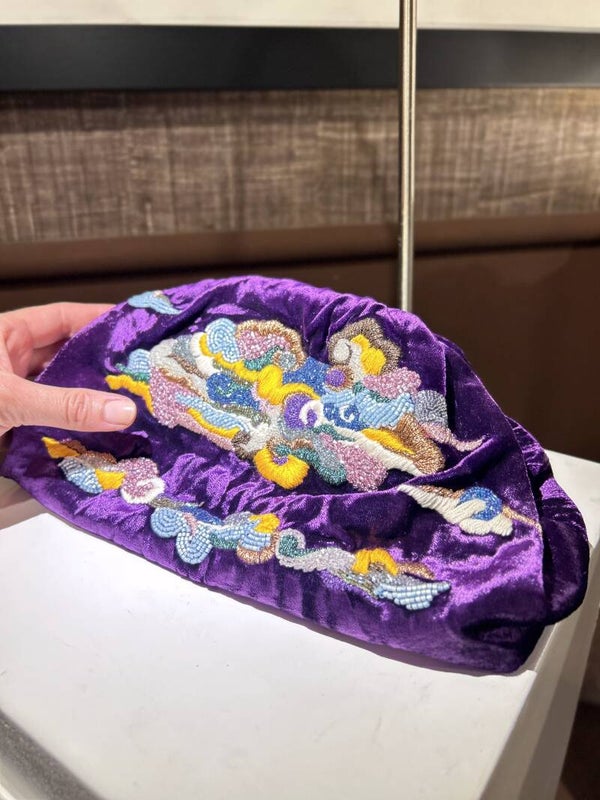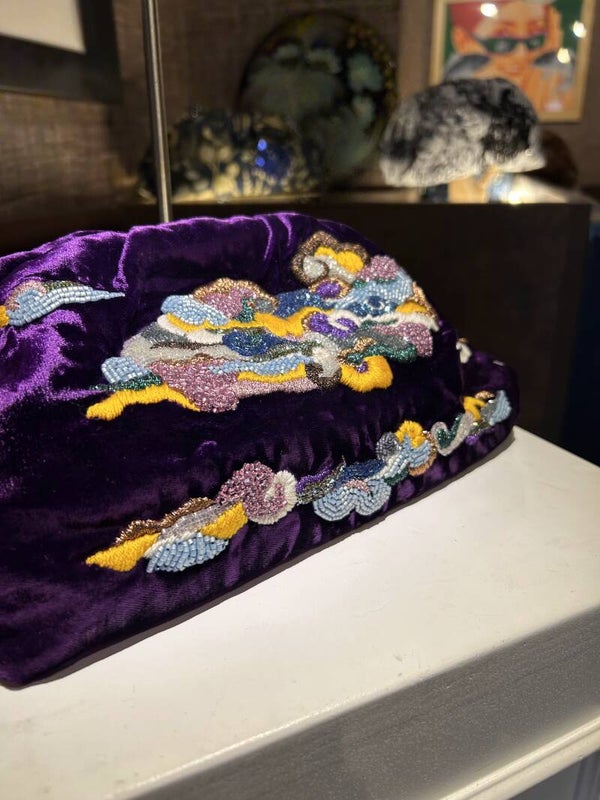 Ispirato ad un antico disegno giapponese. Le Nuvole sono state realizzate a telaio con tecniche miste, perline in vetro e filati di alta qualità. Il corpo centrale delle nuvole è stato poi applicato a mano su un pregiato velluto di seta. Le nuvole più piccole sono state invece ricamate direttamente sul tessuto. Un lavoro di grande precisione e qualità.